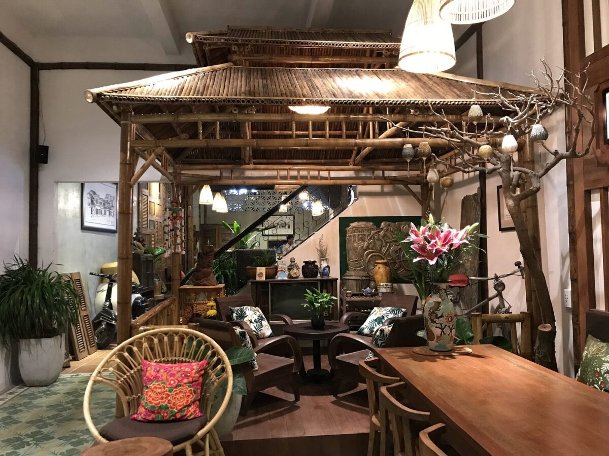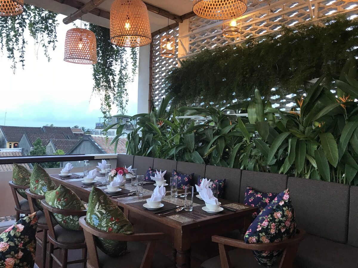 木の梁や竹細工のランプがアクセントになった落ち着いた空間は、ホイアンの街並みによく合う雰囲気です。